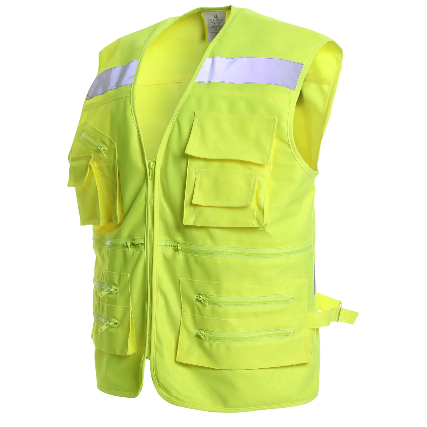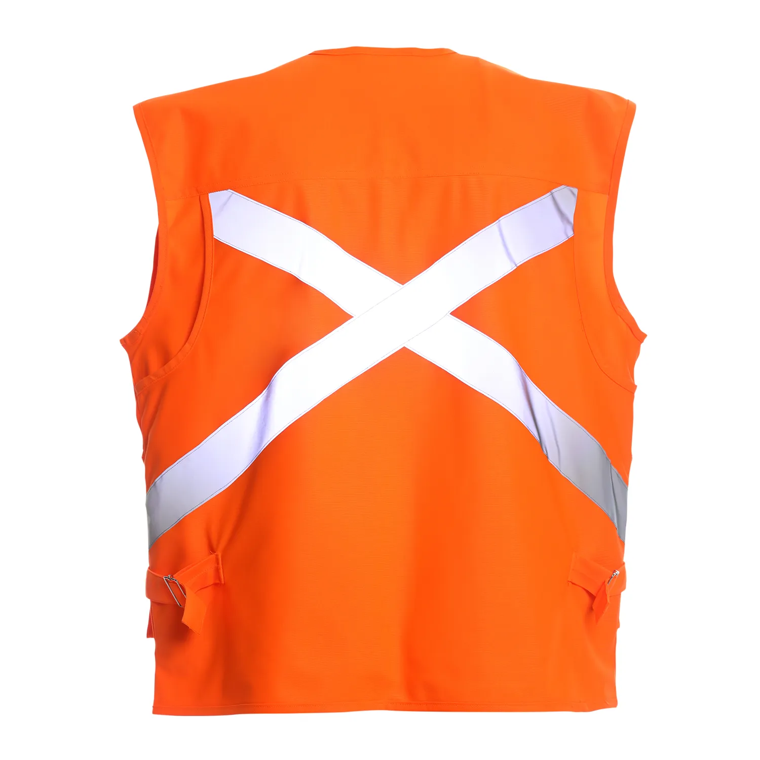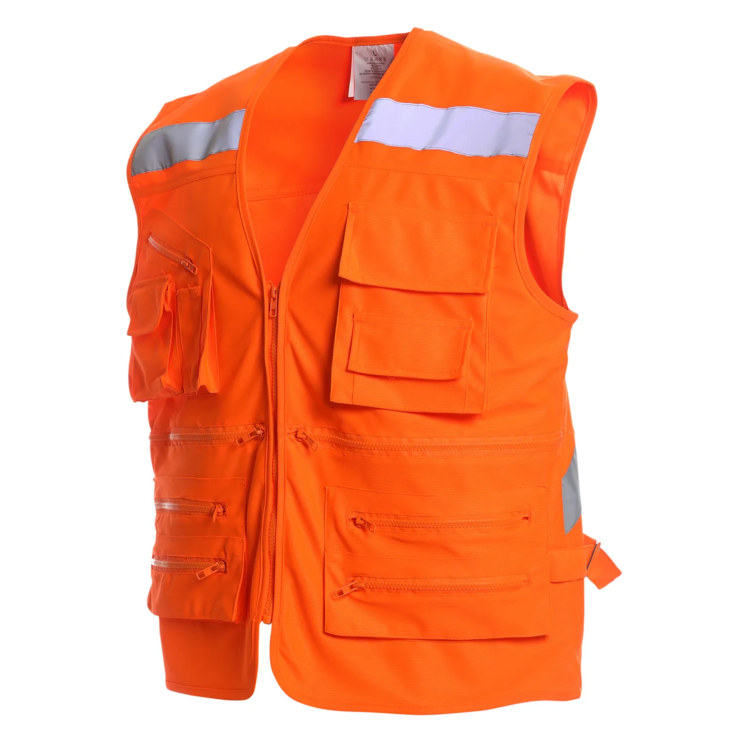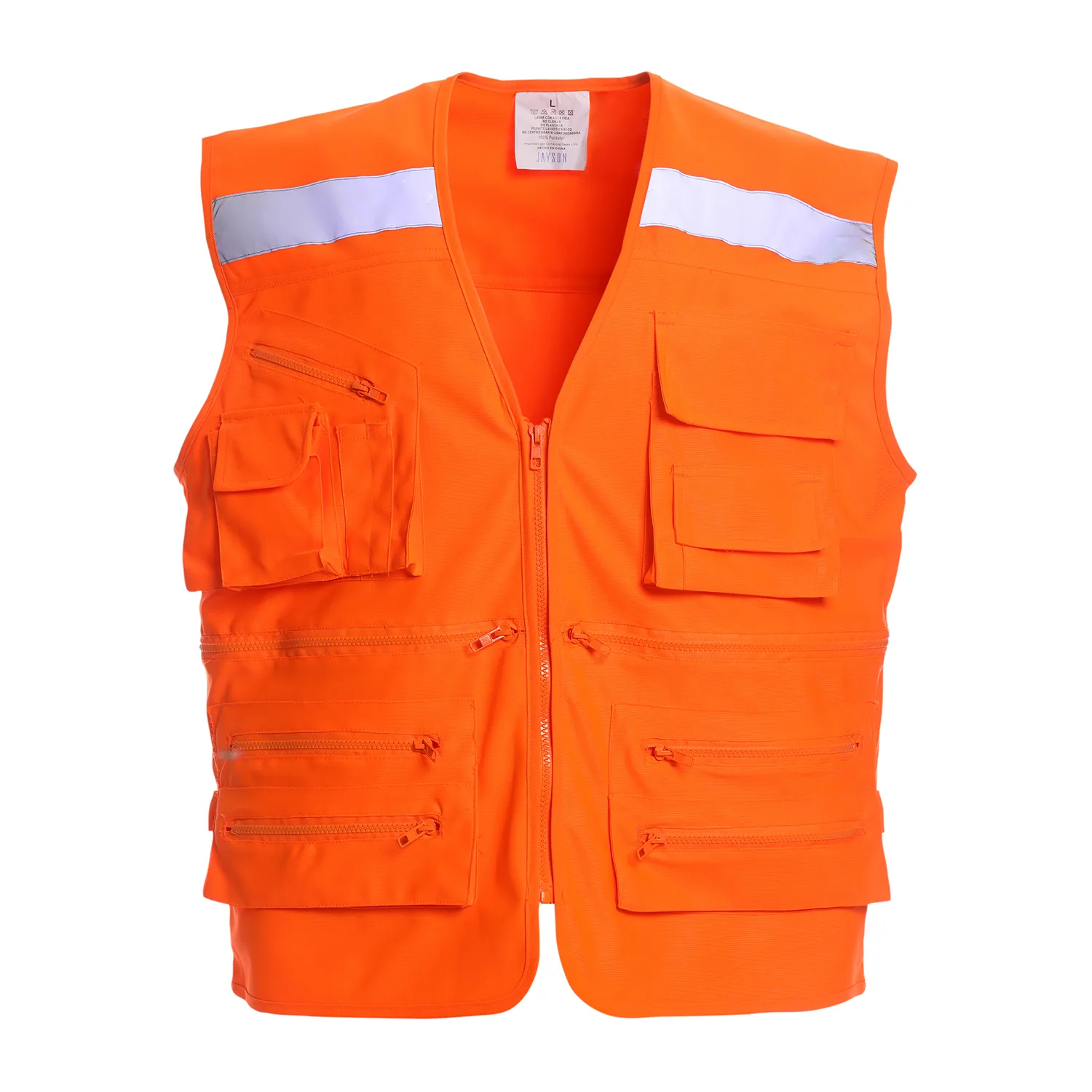 Producto completamente envivado en sus contornos. Cierre frontal con cierre diente de perro plástico para mayor durabilidad. Cinta reflectante canesu delantero y espalda en forma de X, de 2” de ancho. 11 bolsillos multifuncionales, hebilla metálica en costados para mayor ajuste y costuras reforzadas. Producto fácil planchado.