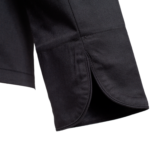 Cuello tipo mao. Finas terminaciones con vivo. Abotonadura frontal con 10 botones plásticos. Bolsillo multiuso en pecho y manga izquierdo. Diseño puño en V. Botón de seguridad. Costuras reforzadas. Gabardina 35% Algodón 65% Poliéster