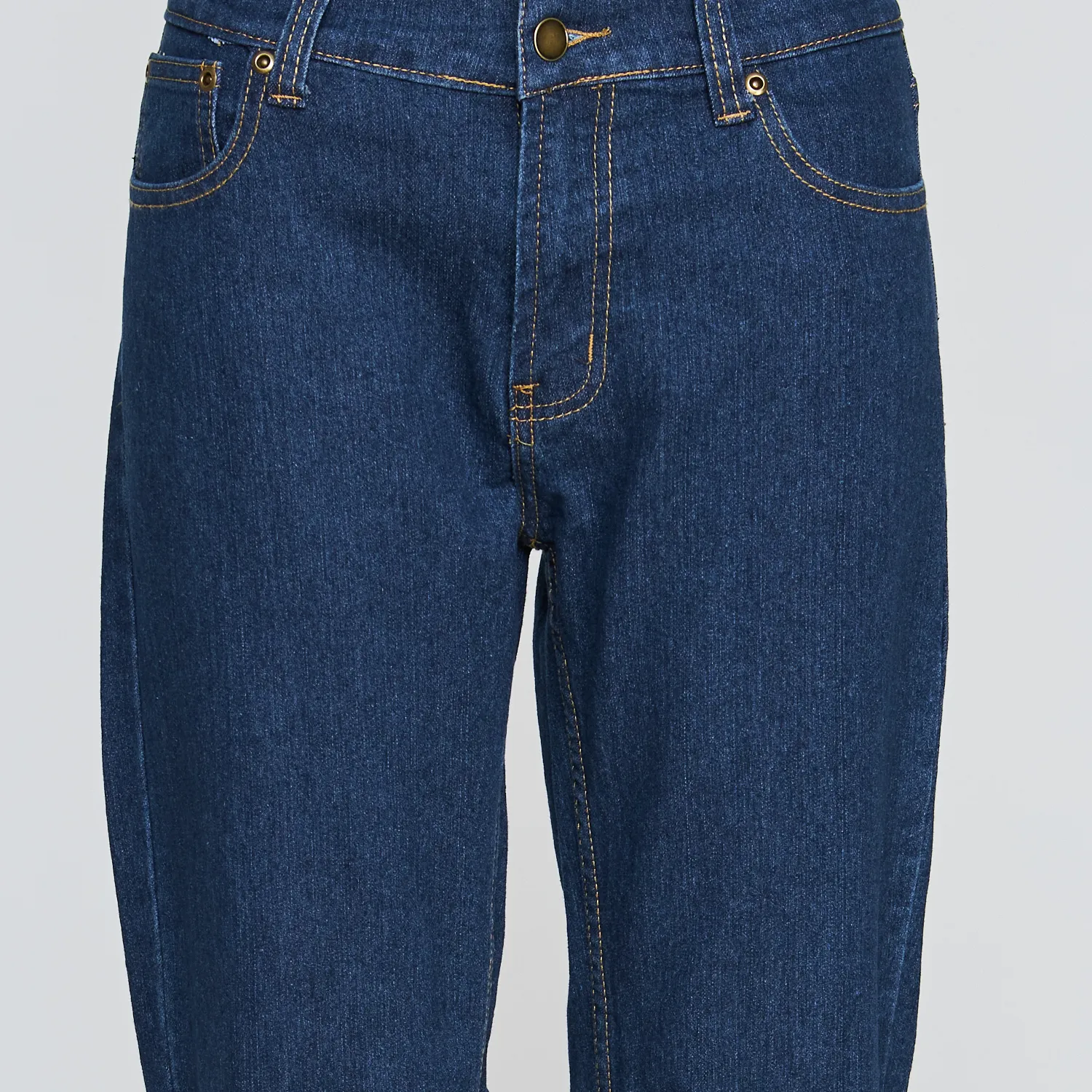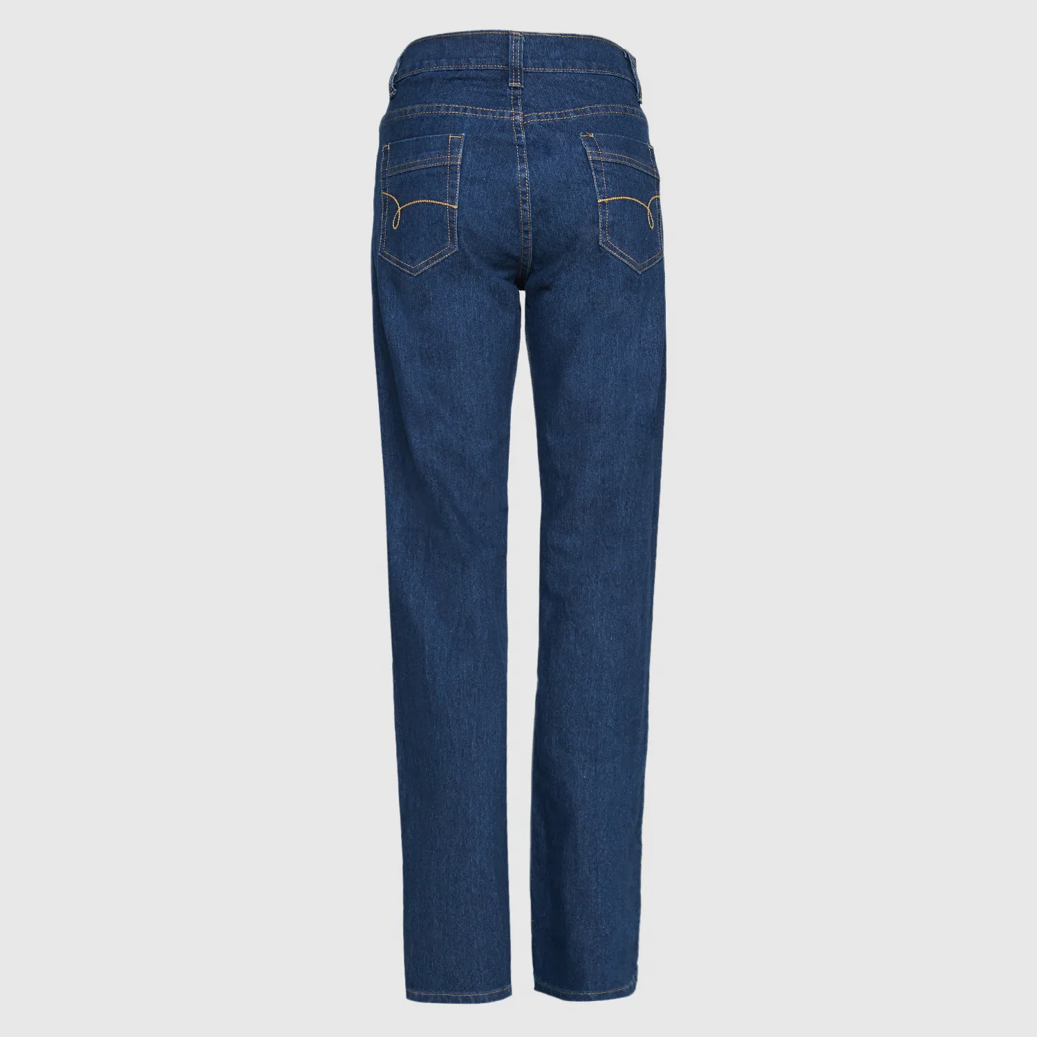 Jeans mujer pre-lavado, tejido altamente resistente. Botón y rivetes metálicos. Cierre de metal cromado. Costuras reforzadas.