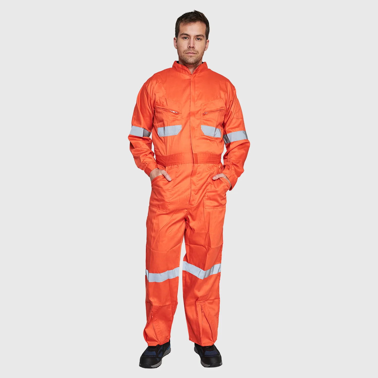 Overol tipo piloto con costuras reforzadas y desarrollado en tela de fácil lavado y planchado. Cuello tipo mao, cierre frontal doble carro para mayor comodidad, 8 bolsillos multifuncionales.